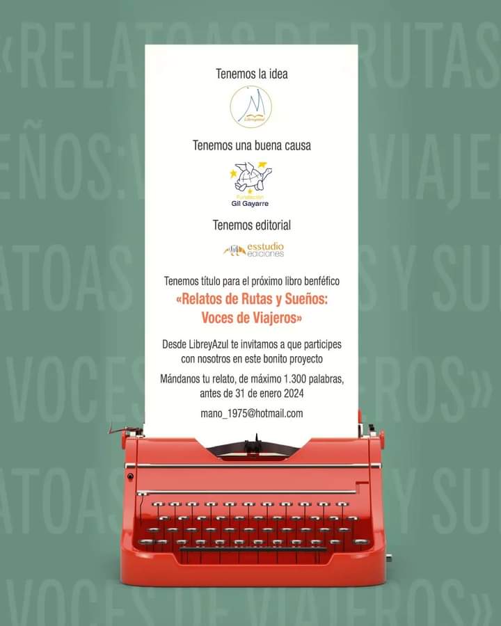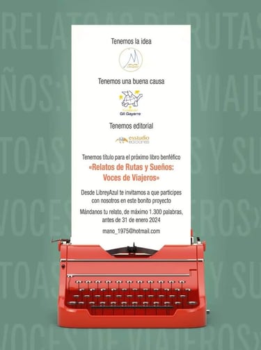 Libreyazul invita a escritores a participar en la creación del próximo libro benéfico "Relatos de Rutas y Sueños: Voces de Viajeros", que será publicado por Esstudio Ediciones. El tema central del libro son los viajes, animando a los escritores a compartir su mejor aventura. Los textos deben tener una extensión máxima de 1300 palabras en formato Word.