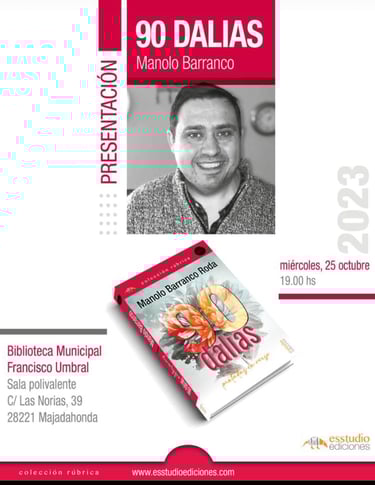 Nos complace invitarles a la presentación del libro "90 Dalias Pintadas en Verso", escrito por Manuel Barranco Roda y editado por la editorial Esstudio Ediciones. La presentación estará a cargo de Amparo Trujillo Molina.
